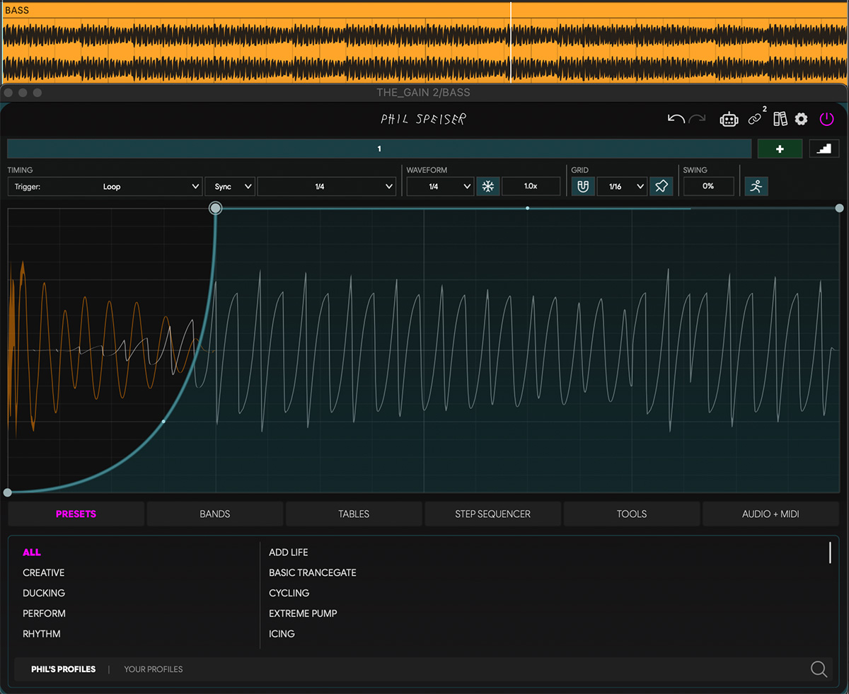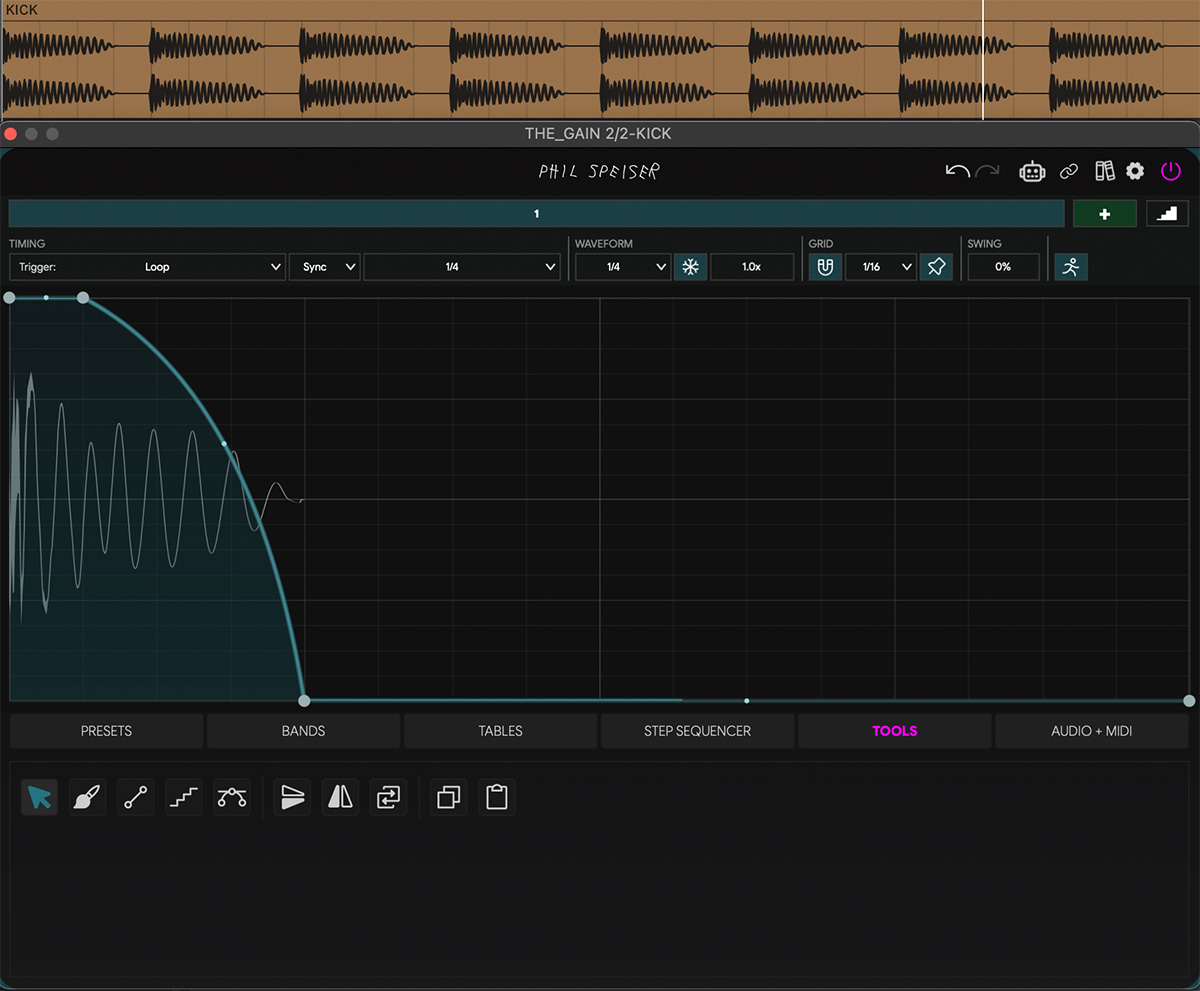 Use THE_GAIN 2 to design the tail and length of your kick. Draw a volume envelope that cuts the sustain exactly where you want it. I usually aim for a 16th note - a quarter of a quarter note - which gives the kick enough body to hit hard without bleeding into the bass's territory.